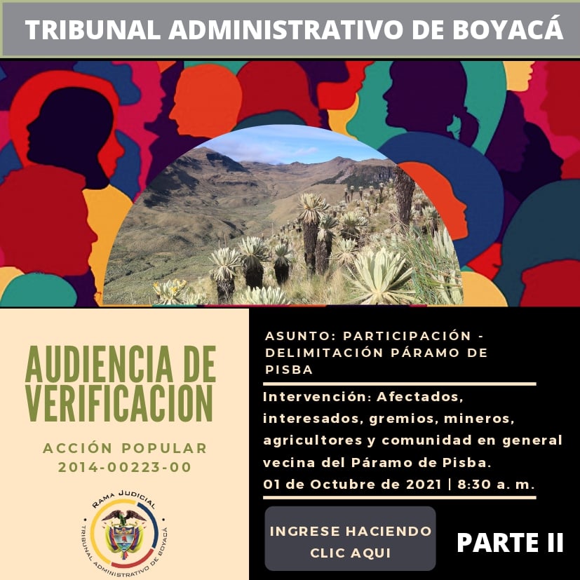 Con el fin de escuchar las diferentes opiniones, inquietudes y percepciones de los habitantes de la comunidad afectada, residente y vecina al Páramo de Pisba -sectores urbano y rural-, gremio agrícola y ganadero, sector minero, Juntas de Acción Comunal, organizaciones cívicas, concejales, líderes ambientales y comunales, y demás representantes e integrantes de la sociedad, de cara a su participación e intervención en el proceso de delimitación del Páramo de Pisba, dentro de la ACCIÓN POPULAR 15001 23 33 000 2014 00223 00, se programo para el próximo VIERNES 1 DE OCTUBRE DE 2021 a las 08:30 AM, una audiencia que será transmitida por el canal oficial del Tribunal Administrativo de Boyacá en la plataforma YouTube a través del siguiente enlace:https://www.youtube.com/watch?v=_QoY1bPv1ks