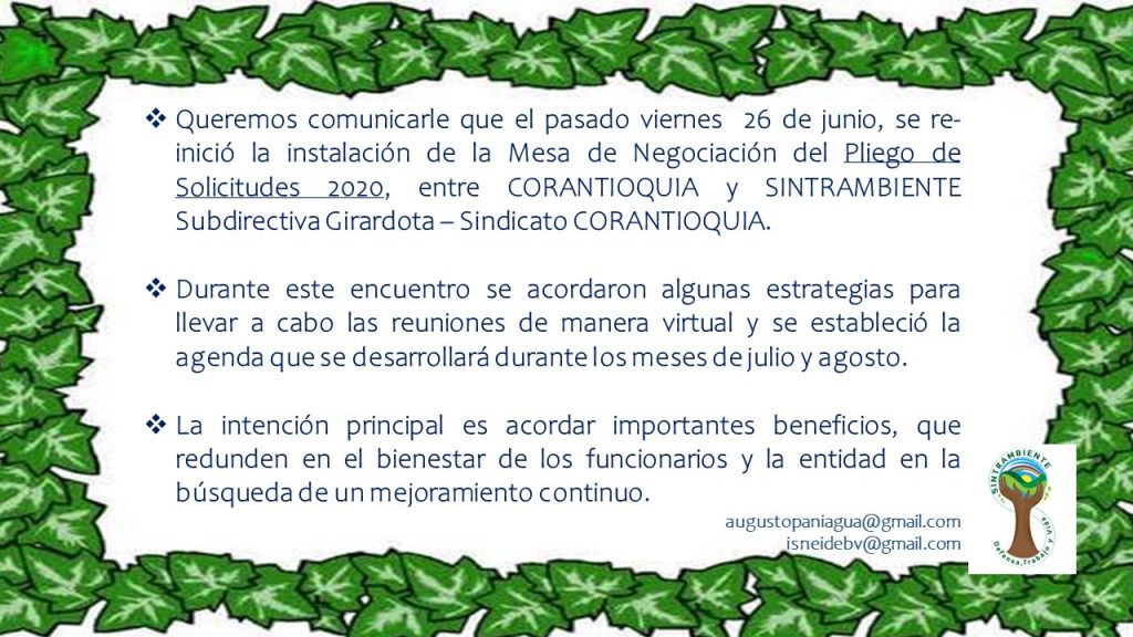 Queremos comunicarle que hemos reiniciado las negociaciones del Pliego de Solicitudes con las directivas de la Corporación Autónoma Regional del